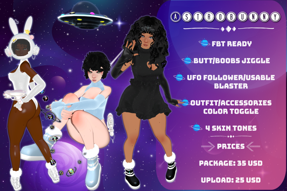 Has: butt/boob, hair physics, 4 different skin tones, a UFO follower, a usable blaster, 10 outfit/accessory toggles and 35 different color options! Please let me know if there are any bugs or anything broken with the model. My dm's are open so feel free to message me whenever.
